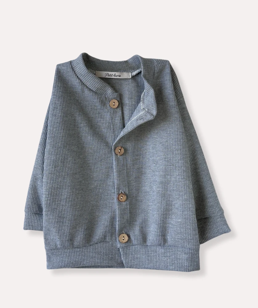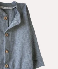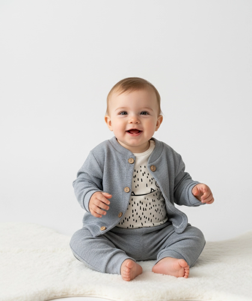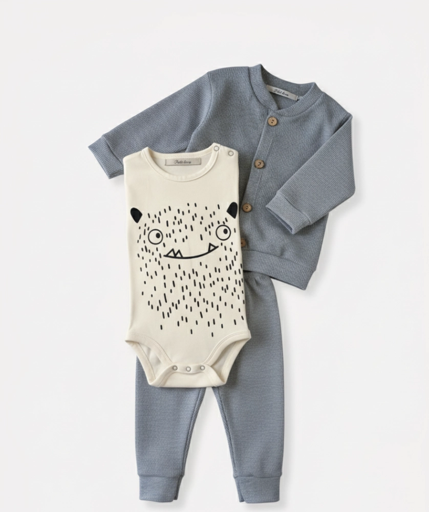 Conjunto bebé Este tierno set está compuesto por un body blanco de algodón suave con estampado de un monstruo, acompañado de un cárdigan tejido en tono gris con botones frontales y un pantalón a juego. Diseñado para brindar comodidad y estilo en todo momento, es ideal para el uso diario o para regalar. – Material: algodón suave y respirable. – Incluye: body estampado + cárdigan tejido + pantalón. – Talles disponibles: 0 a 12 meses.