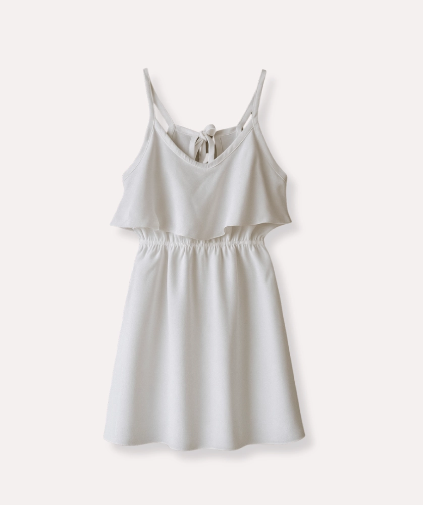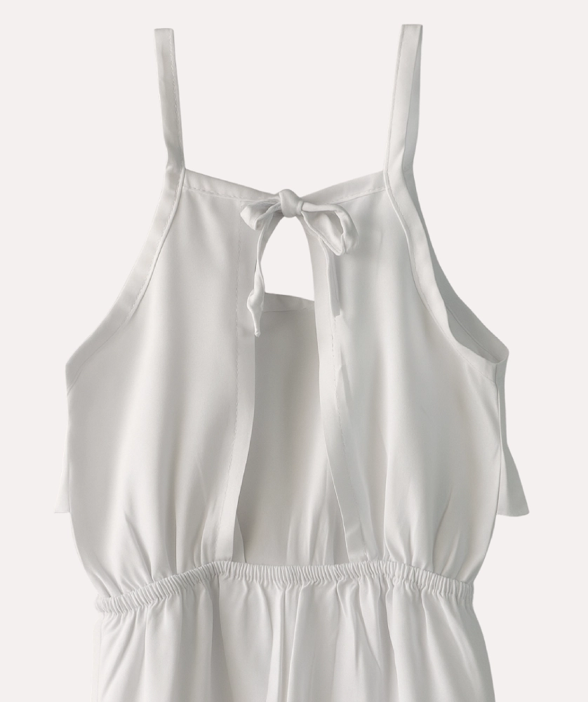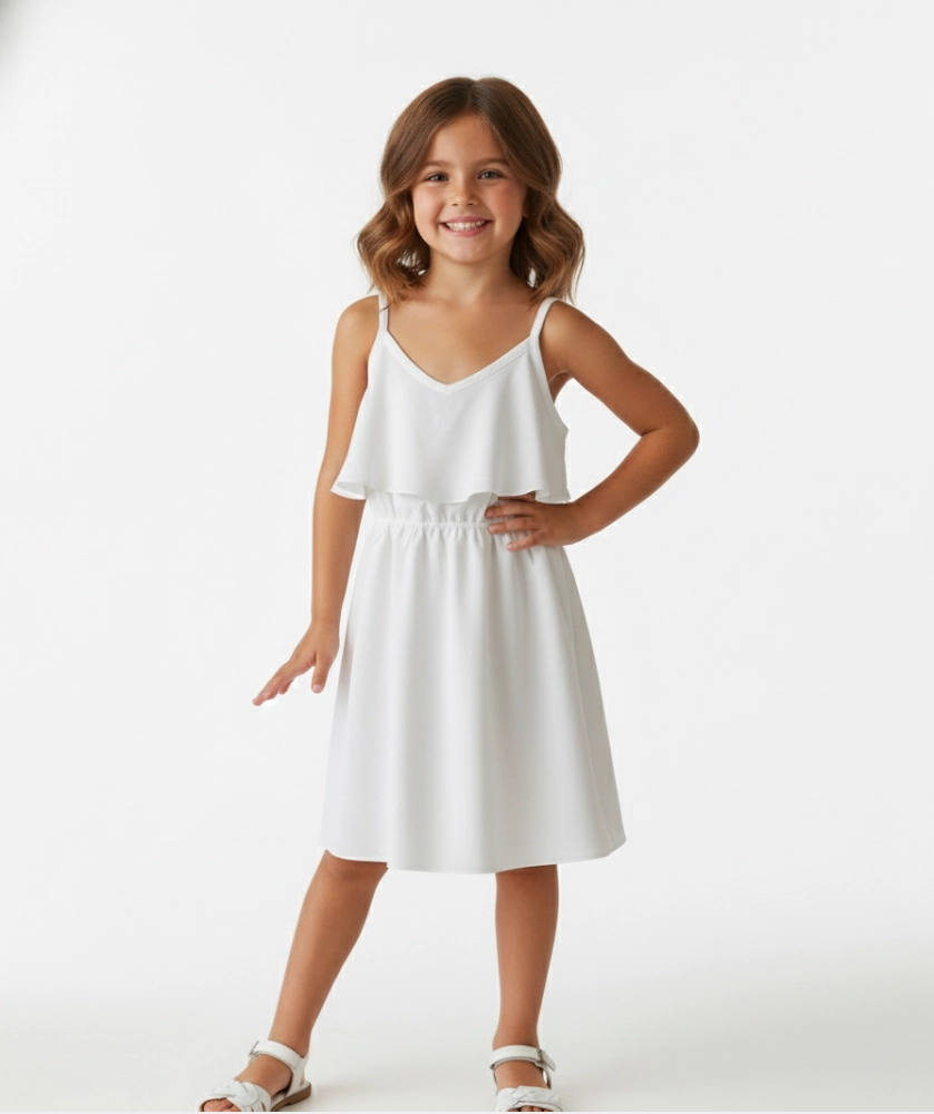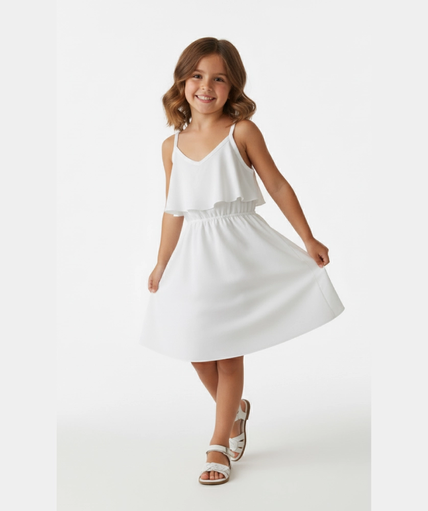 Vestido Catalina, ligero en tono blanco, con tirantes ajustables, escote en V y cintura elástica que crea una silueta A-line con volumen suave en la falda. Tejido suave y caída fluida, sin cierre. Ideal para días soleados y eventos informales, con look casual para combinar con sandalias planas y sombrero de verano. Tallas 4-14.